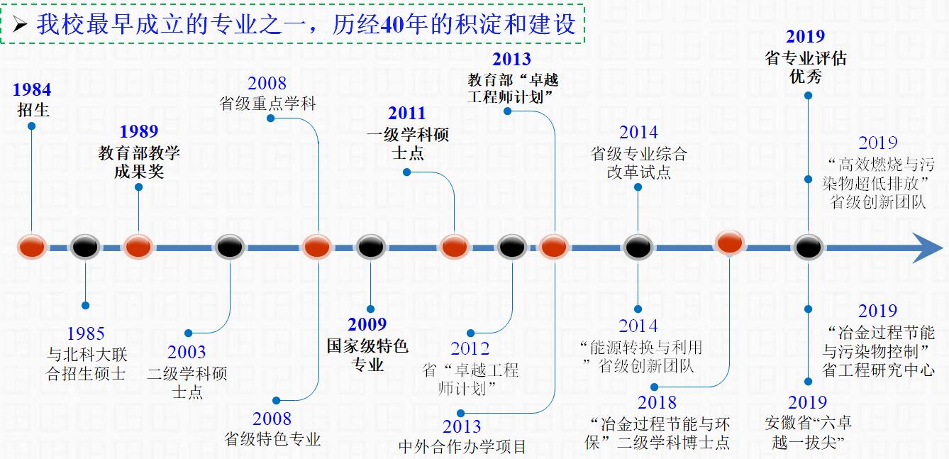 能源与动力工程(热能工程)专业于1984年开始本科招生,1985年与北京科技大学联合培养硕士研究生,2003年获热能与动力工程硕士学位授予权;2008年获批安徽省特色专业和安徽省重点学科,2009年获批国家级特色建设专业;2010年获动力工程工程硕士学位授予权,2011年获动力工程及工程热物理一级学科硕士学位授予权;2013年入选教育部“卓越工程师计划”专业;2014年获批安徽省省级专业综合改革试点专业,2018年增设“冶金过程节能与环保”二级学科博士学位点,2019年获批安徽省“六卓越一拔尖”卓越人才培养创新计划,并入选国家级一流本科建设点;拥有“冶金过程节能与环保”二级学科博士学位点、“能源转换与利用”与“高效燃烧与污染物超低排放”两个省级创新团队、 “冶金过程节能与污染物控制” 省教育厅工程技术研究中心及“燃烧新技术与高效换热实验室”马鞍山市重点实验室。
